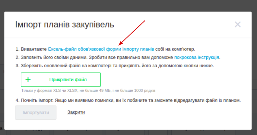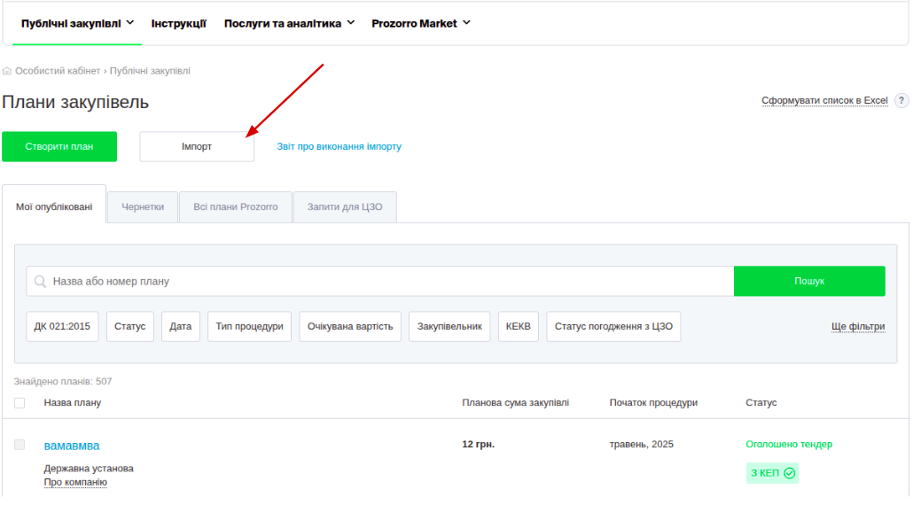 Для того щоб скористатись файлом імпорту плану, перейдіть у вкладку «Мої плани закупівель» і натисніть кнопку «Імпорт».