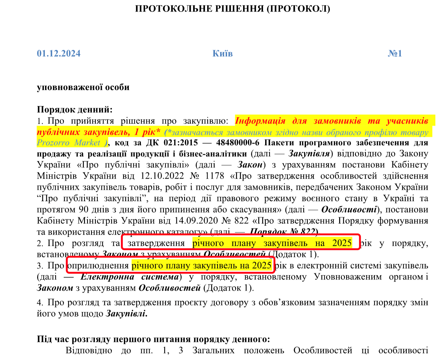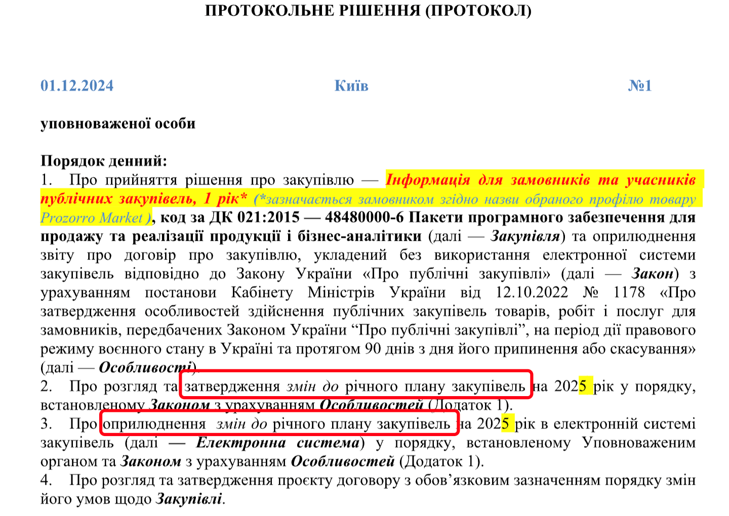 Ось приклад протоколу затвердження річного плану щодо проведення закупівлі порталу «Радник у сфері публічних закупівель» від 100 тис. грн (річна потреба) через Prozorro Market.