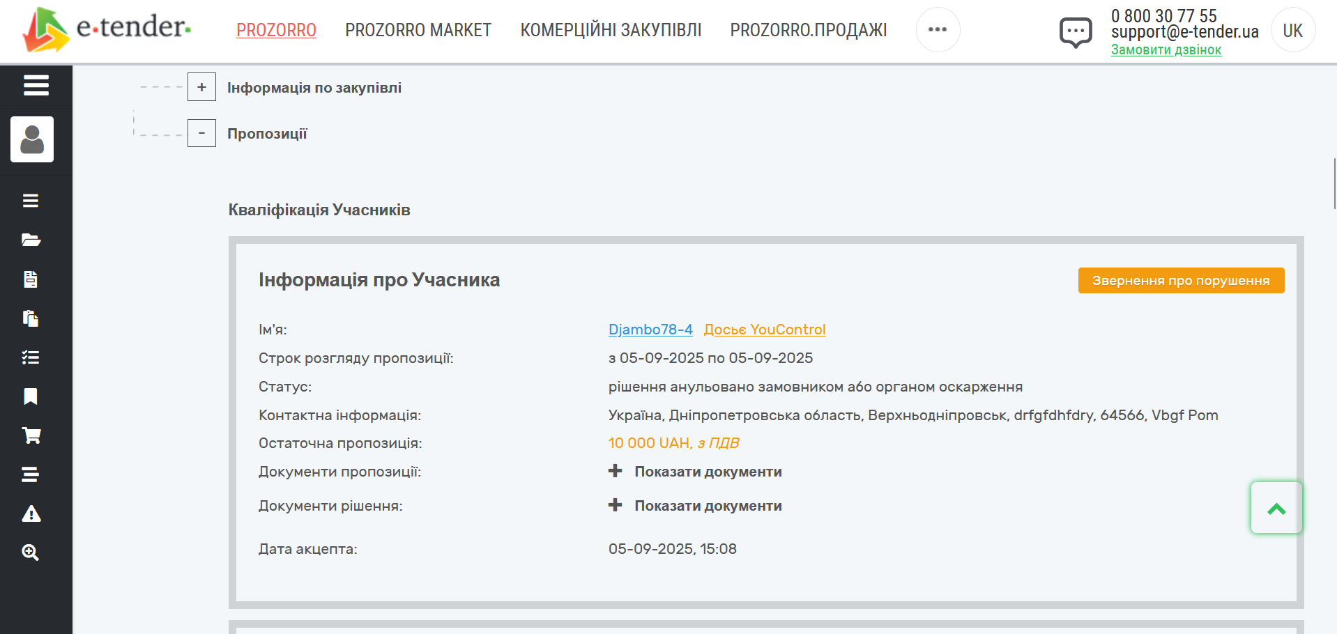 2. У блоці з інформацією про постачальника натисніть кнопку «Звернення про порушення».