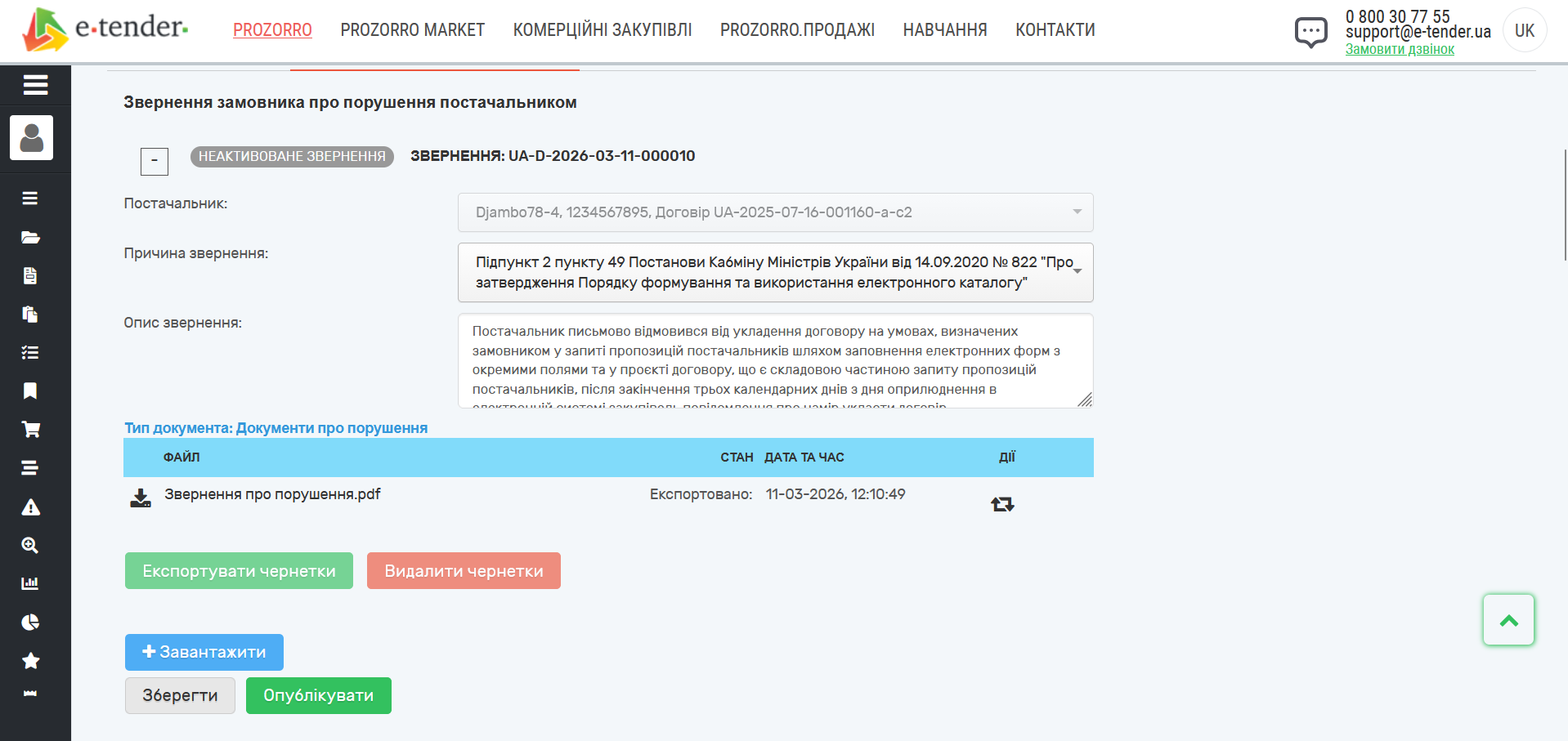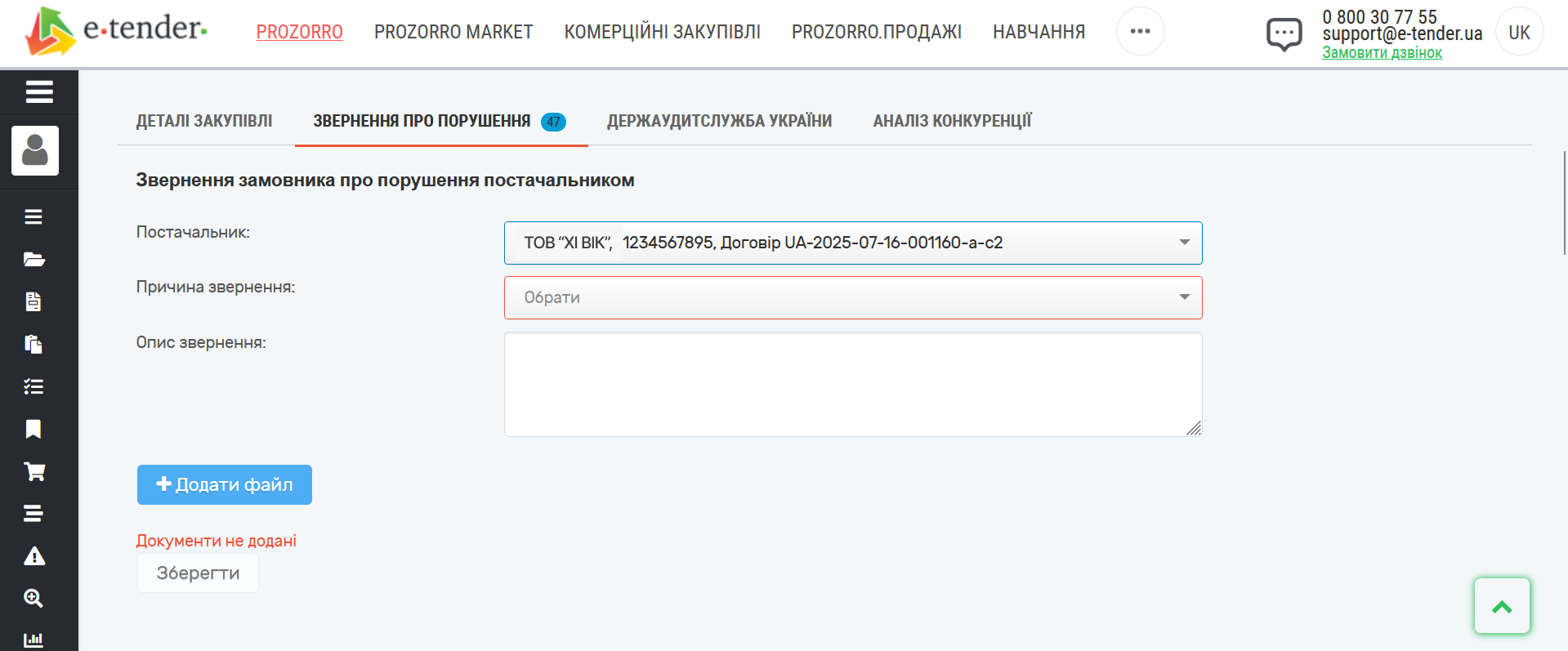 Далі розглянемо, як працює оновлений механізм подання звернення про порушення постачальника в Prozorro.Market на прикладі електронного майданчика E-Tender.
