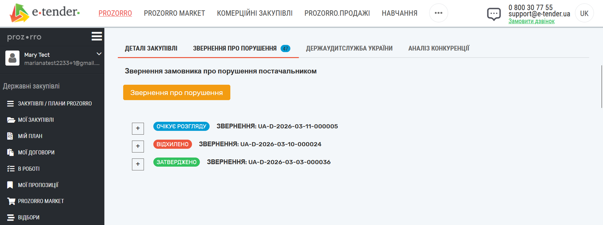 Після публікації звернення додаткові дії від замовника не потрібні. Відстежувати статус розгляду можна на сторінці закупівлі у вкладці «Звернення про порушення».