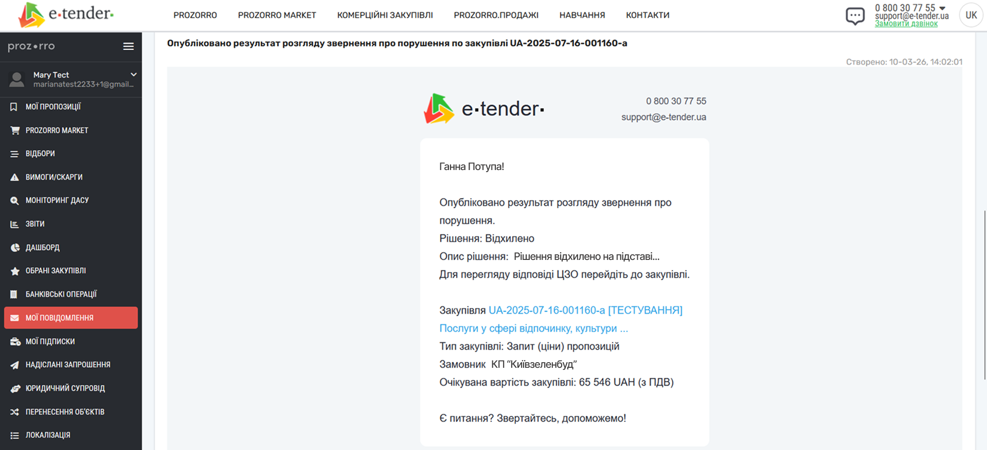 У разі зміни статусу звернення або розміщення постачальником інформації щодо спростування порушення замовник отримає відповідне сповіщення в особистому кабінеті та на електронну пошту.