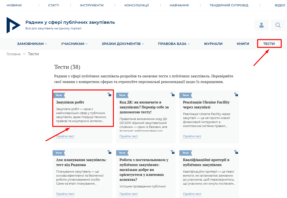 Отже, перейдіть у розділ «Тести», пройдіть тест «Закупівля робіт» і переконайтеся, що ви впевнено орієнтуєтесь у ключових аспектах будівельних закупівель.