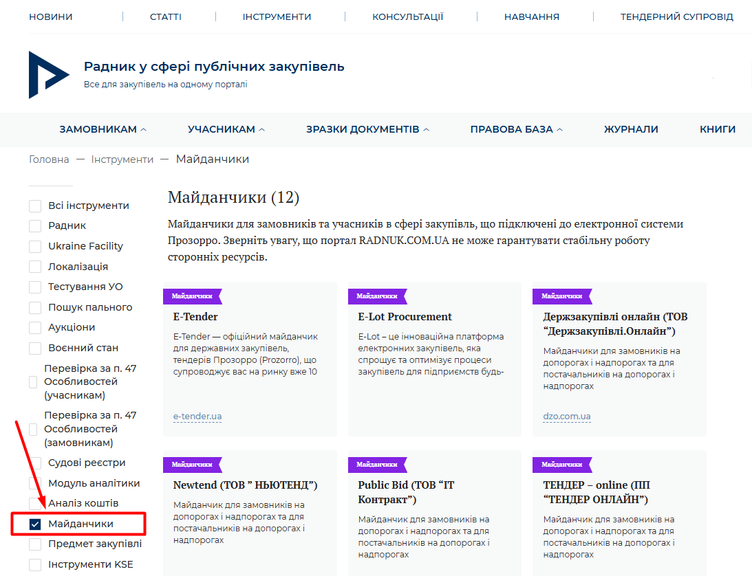 На сьогодні функціонує 12 електронних майданчиків. Для зручності роботи на порталі «Радник» у розділі інструментів зібрано перелік електронних майданчиків (див. Рисунок), що допомагає швидко вибрати відповідний сервіс для роботи у сфері закупівель.