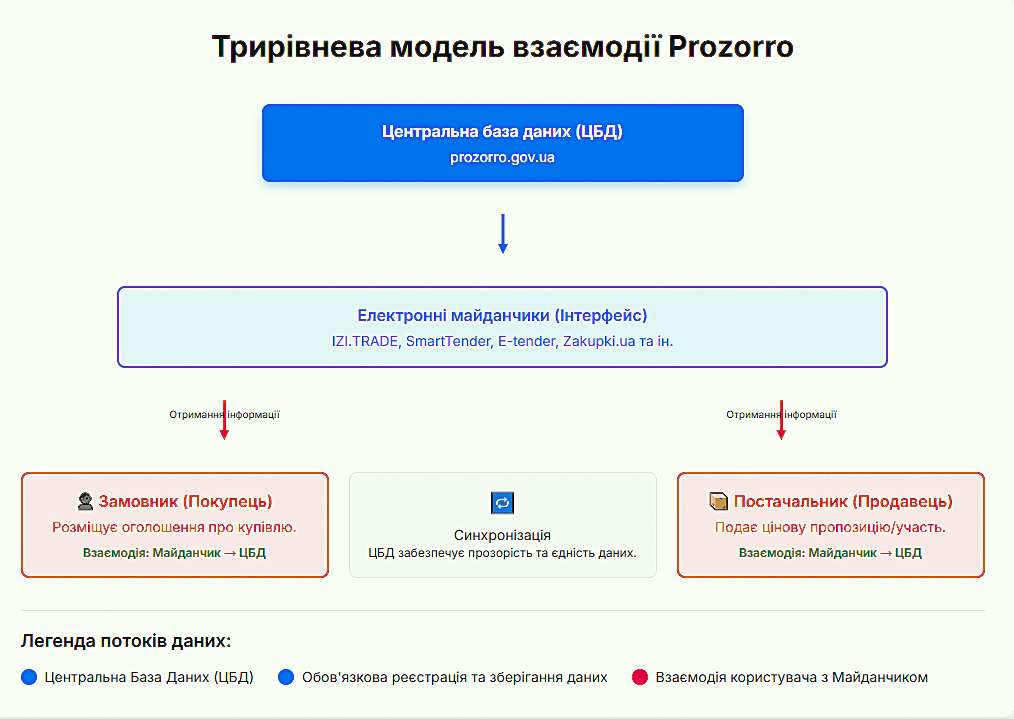 Система Prozorro — база даних, через яку проходять усі етапи закупівлі: від планування до підписання договору. Доступ до неї здійснюється через авторизовані електронні майданчики — посередників між користувачем і системою.
