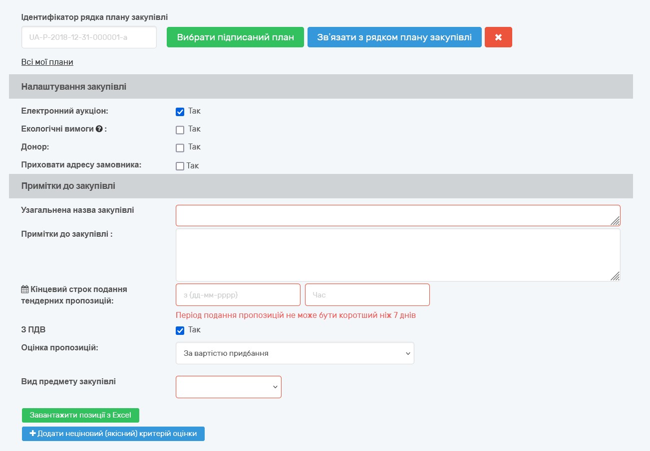 У кабінеті замовника на майданчику потрібно, зокрема, зазначити предмет закупівлі (за кодом ДК 021:2015), очікувану вартість, джерело фінансування та орієнтовні строки. Система автоматично присвоює ідентифікатор UA-P-… і публікує план у Prozorro.