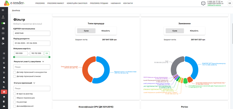 Команда E-Tender розробила на майданчику зручний інструмент для аналізу постачальників — «Дашборд», який допоможе швидко сформувати перше уявлення про компанію (див. рисунок Розділ «Дашборд» на E-Tender).