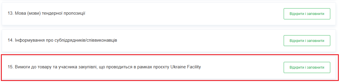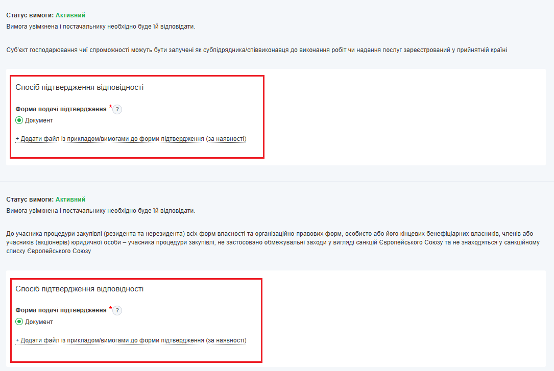 Під час створення закупівлі замовником у блоці «Електронна тендерна документація» ця вимога активується автоматично, і постачальник має на неї відповідати. Технічно її можна вимкнути при редагуванні закупівлі, однак робити це не рекомендується з міркувань дотримання вимог у рамках проєкту Ukraine Facility.