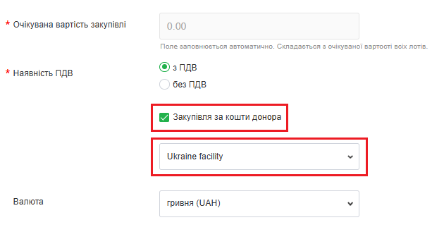 Вони з’являються автоматично, після того як замовник під час створення закупівлі вибирає «Закупівля за кошти донора Ukraine Facility».