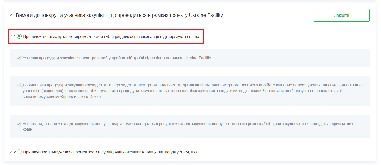 - Учасник процедури закупівлі зареєстрований у прийнятній країні відповідно до вимог Ukraine Facility;