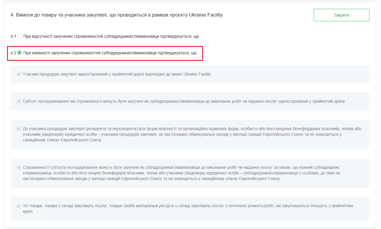 - Субʼєкт господарювання, чиї спроможності можуть бути залучені як субпідрядника / співвиконавця до виконання робіт чи надання послуг, зареєстрований у прийнятній країні;