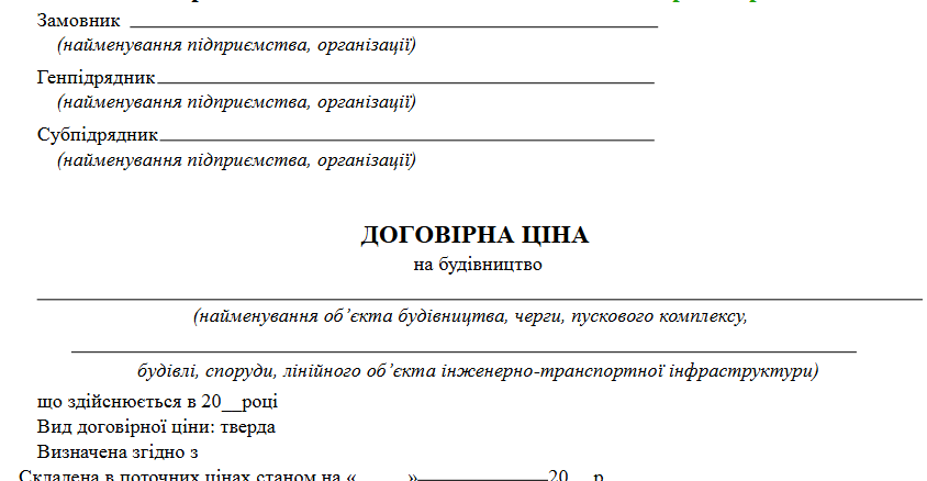 договірна ціна – кошторис, яким визначається вартість будівельних робіт, узгоджена сторонами (замовником та підрядником) та обумовлена у договорі;