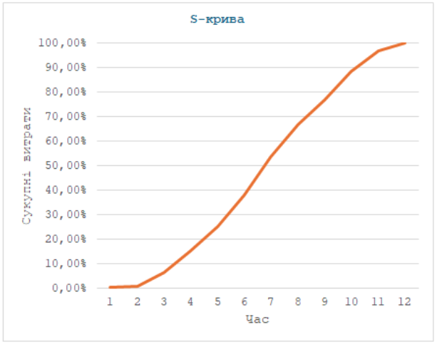 37. Для підготовки кошторису проєкту, окрім загальної вартості проєкту, ініціатор проєкту має підготувати розбивку на кожен рік реалізації та експлуатації проєкту. Це дозволить врахувати фінансові потреби проєкту у середньостроковому бюджетному плануванні. Водночас така розбивка має базуватися на реалістичному графіку виконання відповідних робіт з підготовки та реалізації проєкту і у графічному вигляді відповідати S-подібній кривій, яка відображає накопичену вартість реалізації проєкту з плином часу.