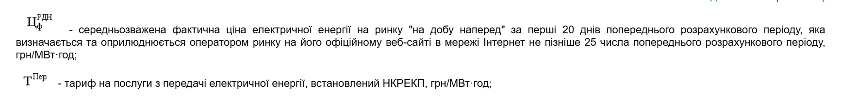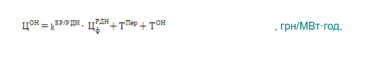 kБР/РДН – коефіцієнт, який враховує ризики від коливання цін на балансуючому ринку та ринку “на добу наперед”, та становить 1,3 відносних одиниць (у період з жовтня по грудень 2024 року (включно) – 1,5 відносних одиниць);