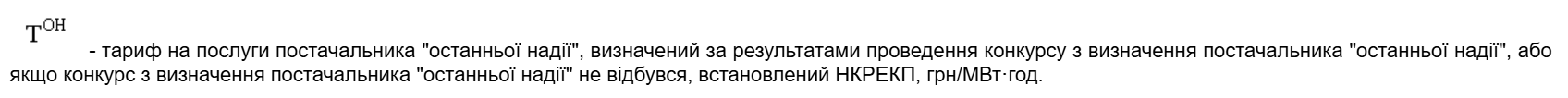2.1. Ціна, за якою здійснюється постачання електричної енергії постачальником “останньої надії”, для побутових споживачів та непобутових споживачів, у тому числі малих непобутових споживачів (крім випадків застосування фіксованих цін на електричну енергію за рішенням Кабінету Міністрів України в рамках покладення спеціальних обов’язків на постачальника “останньої надії”), приєднаних до електричних мереж на території ліцензованої діяльності оператора системи розподілу / МСР, приєднаної до системи розподілу, розраховується за формулою