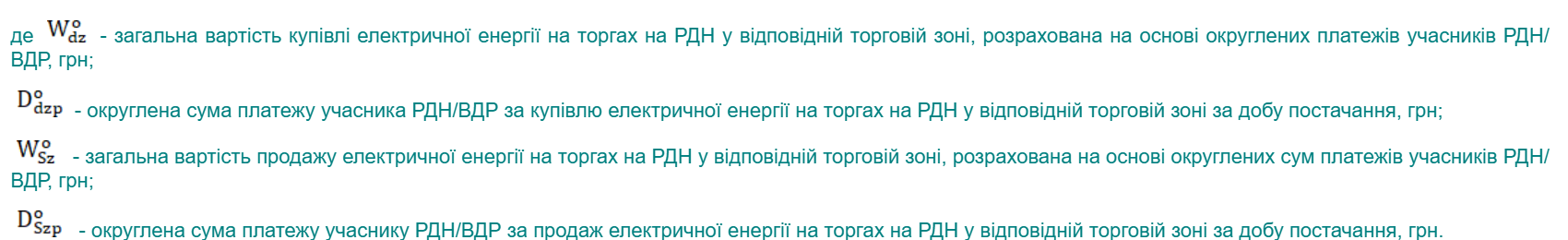 де DSzp – платіж учаснику РДН/ВДР за продаж електричної енергії на торгах РДН у відповідній торговій зоні за добу постачання, грн.
