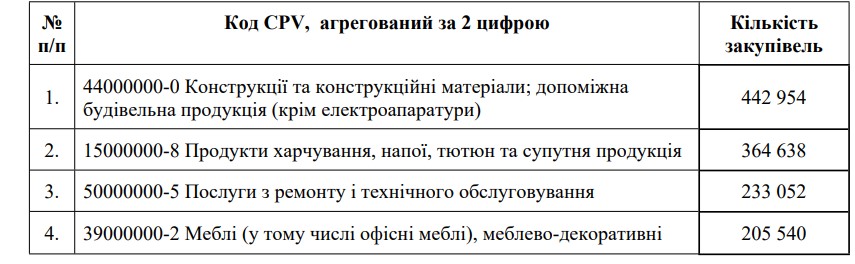 Закупівлі, агреговані за другою цифрою коду основного словника національного класифікатора України ДК 021:2015 “Єдиний закупівельний словник”, затвердженого наказом Міністерства економічного розвитку і торгівлі України від 23.12.2015 № 1749 (далі – закупівлі, агреговані за другою цифрою коду CPV) – перелік закупівель, що включає всі закупівлі, у яких предмет закупівлі визначений за показником другої – восьмої цифри основного словника національного класифікатора України ДК 021:2015 “Єдиний закупівельний словник”, затвердженого наказом Міністерства економічного розвитку і торгівлі України від 23.12.2015 № 1749 (далі – CPV), та показник перших двох цифр є однаковим.
