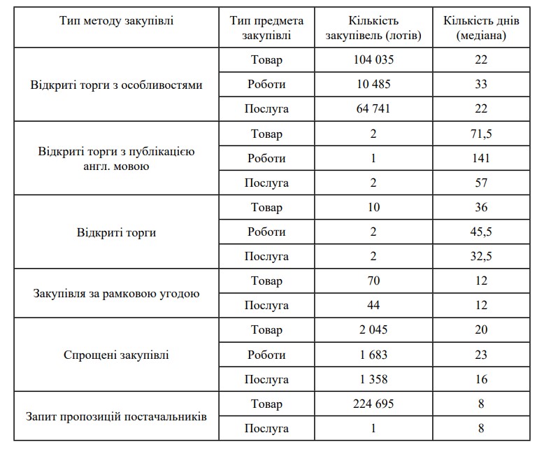 Під час підготовки Звіту використовувалася інформація з центральної бази даних електронної системи закупівель, а саме дані веб-порталу Уповноваженого органу з питань закупівель, модулів аналітики bi.prozorro.org та bipro.prozorro.org, а також інформація, що надається органами державної влади, адміністратором електронної системи закупівель та іншої інформації відповідно до законодавства, узагальнена інформація від органів, уповноважених на здійснення контролю у сфері закупівель, та централізованих закупівельних організацій.