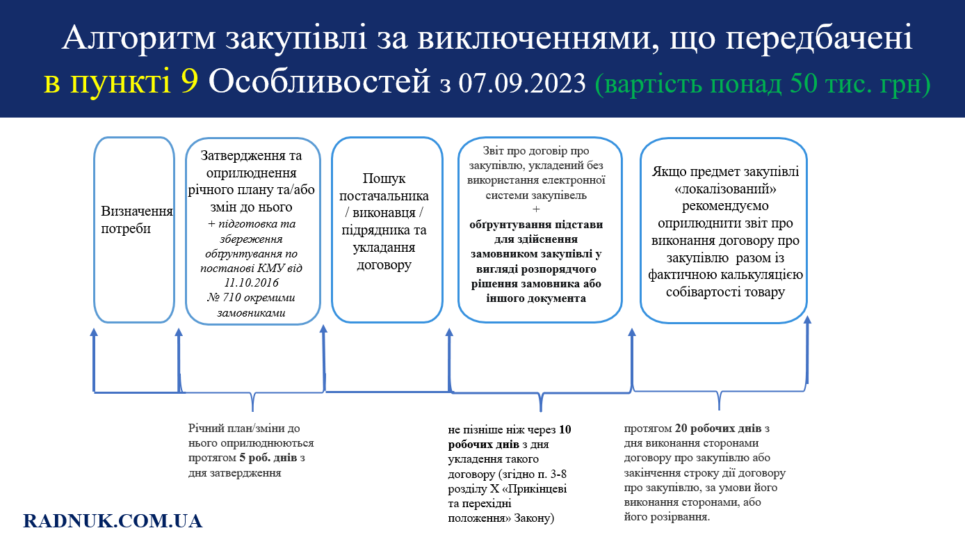«Необхідність оприлюднювати обгрунтування стосується також закупівель, що здійснюються згідно з пунктом 9 Особливостей. Так, під час здійснення публічних закупівель, передбачених цим пунктом, без використання електронної системи закупівель замовники повинні відповідно до Закону дотримуватися принципів здійснення публічних закупівель, зокрема максимальної економії, ефективності, запобігання корупційним діям і зловживанням, та за результатами їх здійснення за умови, що вартість закупівлі становить або перевищує 50 тис. гривень, оприлюднювати в електронній системі закупівель звіт про договір про закупівлю, укладений без використання електронної системи закупівель, відповідно до пункту 3-8 розділу X “Прикінцеві та перехідні положення” Закону, а також обґрунтування підстави для здійснення замовником закупівлі відповідно до цього пункту.
