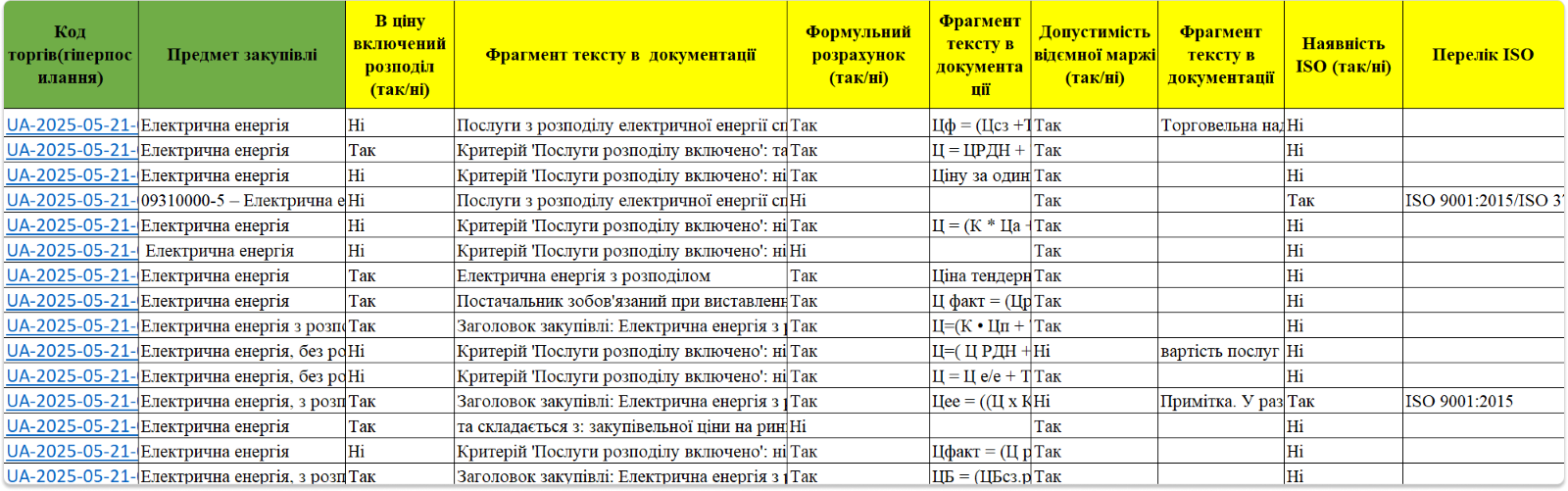 AI допомагає визначити, коли така вимога зайва і може необґрунтовано обмежувати конкуренцію, та підсвічує її постачальнику. - Постачання vs Розподіл е/е. У тендерах на електроенергію AI автоматично визначає, де йдеться лише про постачання, а де — про постачання разом із розподілом.