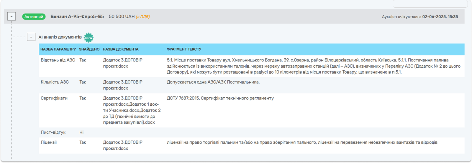 Наприклад, ви постачальник палива. Ви знайшли цікавий тендер, відкриваєте його умови — і ми відразу виводимо відповіді на ваші ключові запитання: