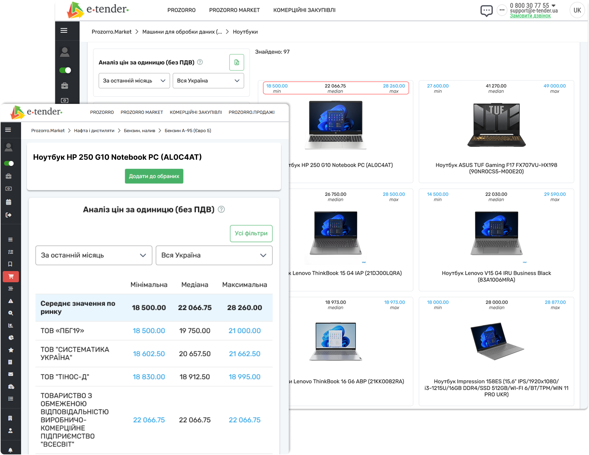 - Аналіз ціни конкурентів на Prozorro Market — вибудувати цінову стратегію без Excel та ручного перегляду десятків документів цілком реально. З цифровими інструментами можна побачити найсвіжіші ціни по товарах всього за декілька секунд. Ціни конкурентів, перелік постачальників, динаміка по регіонах — усе це з актуальністю до вчорашнього дня.