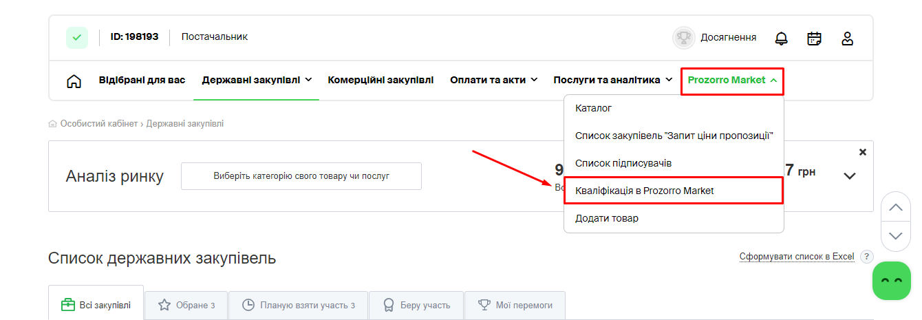 4. Перейдіть в особистому кабінеті постачальника в розділ «Prozorro Market» — «Кваліфікація в Prozorro Market».