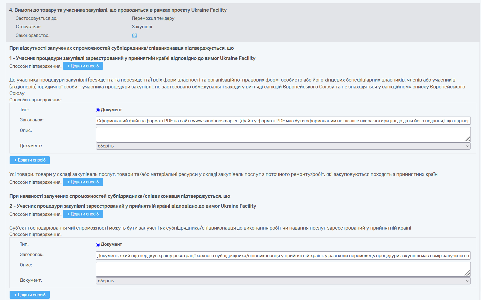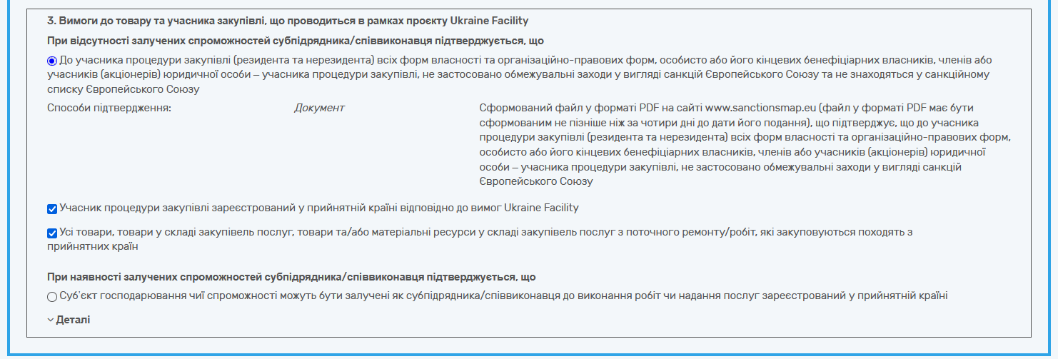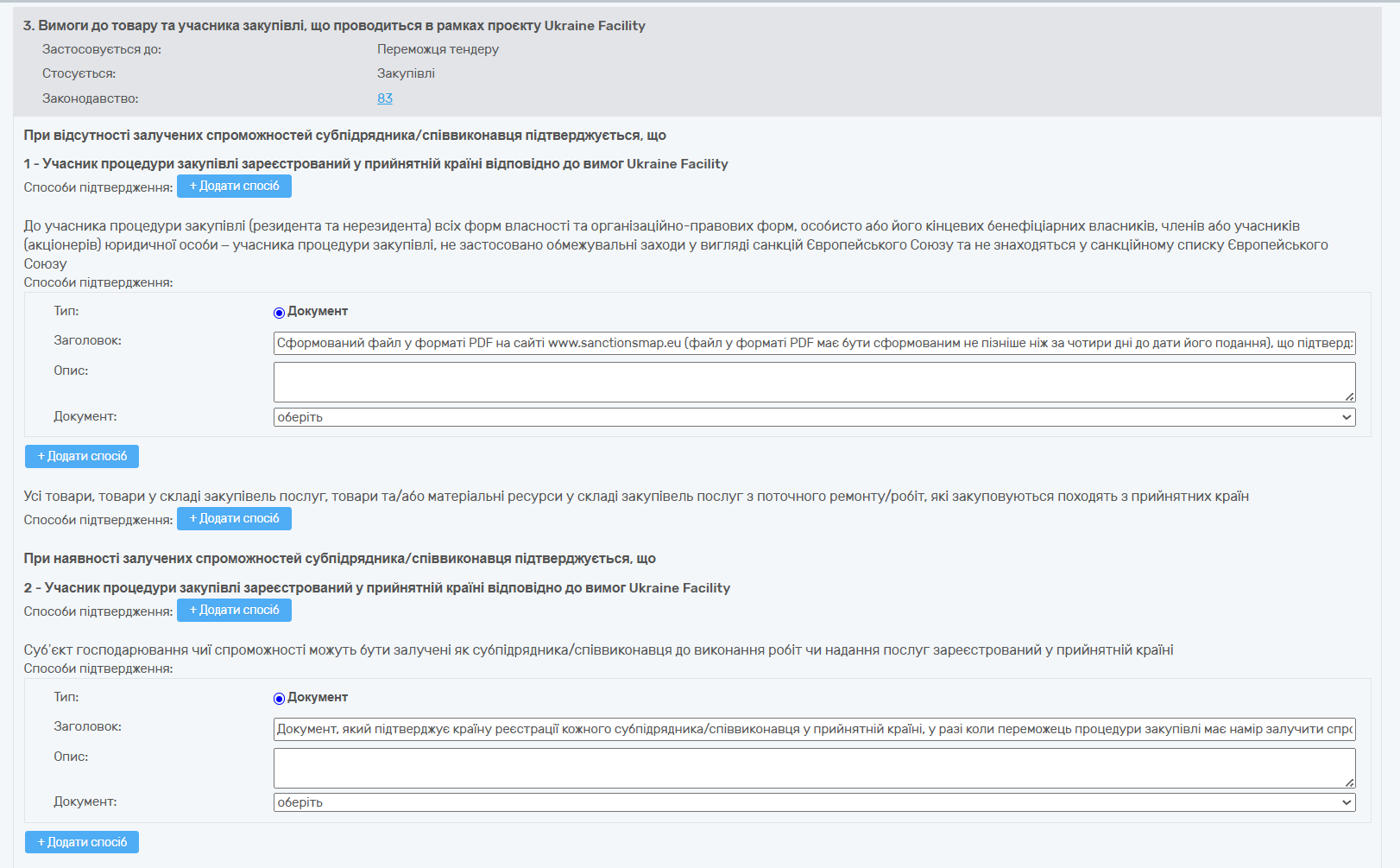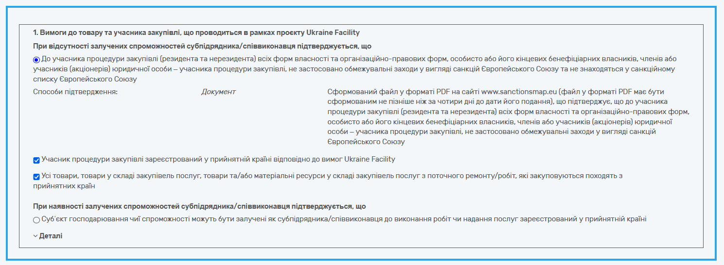 - автоматично сформовані критерії в розділі «Вимоги до товару та учасника закупівлі, що проводиться в рамках проєкту Ukraine Facility»;