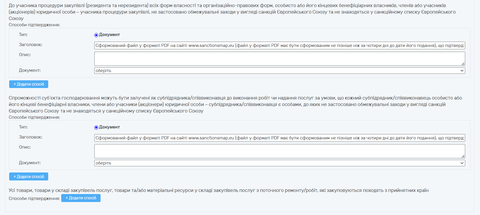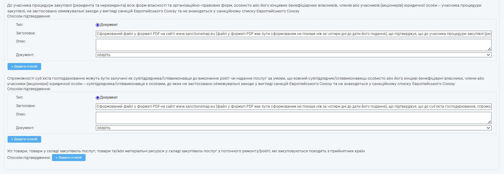 - попередньо налаштовані поля: країна походження товару, країна реєстрації учасника, підтвердження відсутності санкцій;