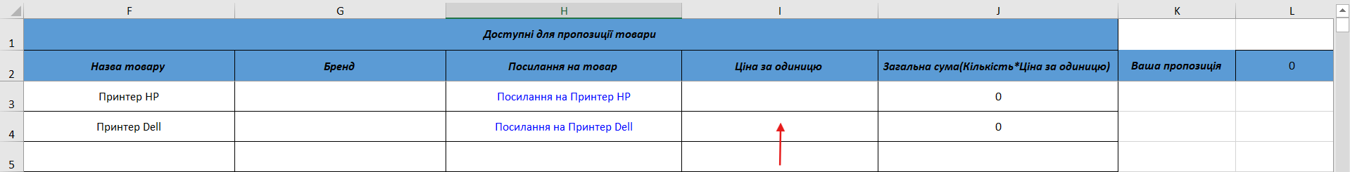 2. Заповніть ціну за одиницю навпроти товару, який пропонуєте змовнику, а загальну суму пропозиції Excel розрахує автоматично (Рис. 3).
