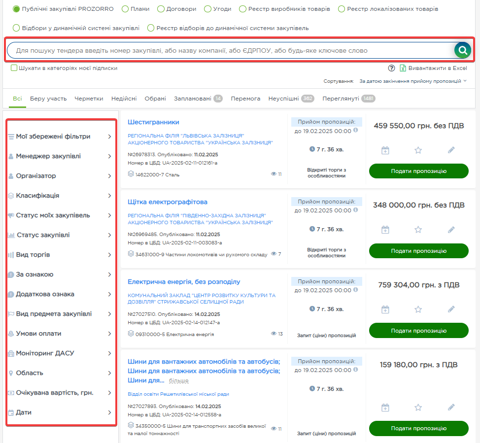1. Через пошук — введіть ключові слова, використайте фільтри або вкажіть номер тендеру (Рис. 1).