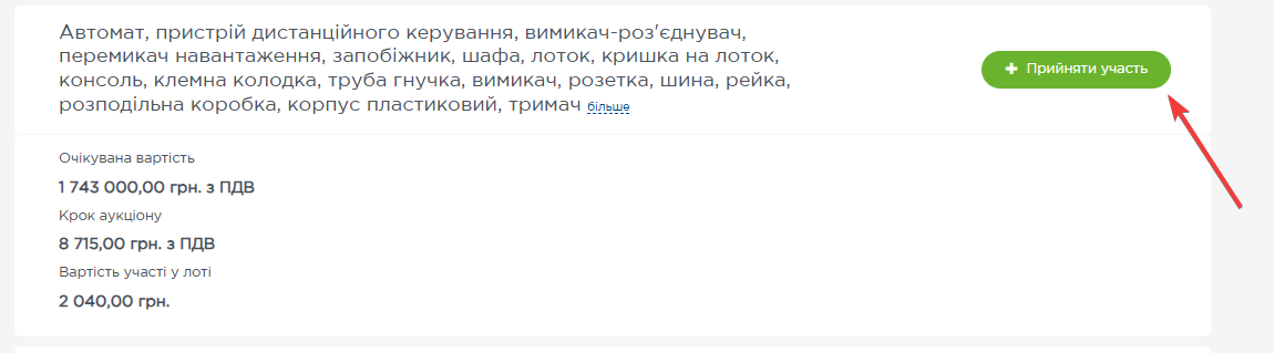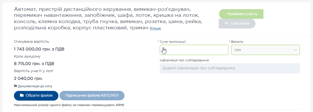 Після заповнення всіх електронних полів виберіть лоти, до яких бажаєте подати свою пропозицію, і натисніть «Прийняти участь» (Рис. 10).