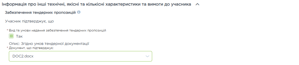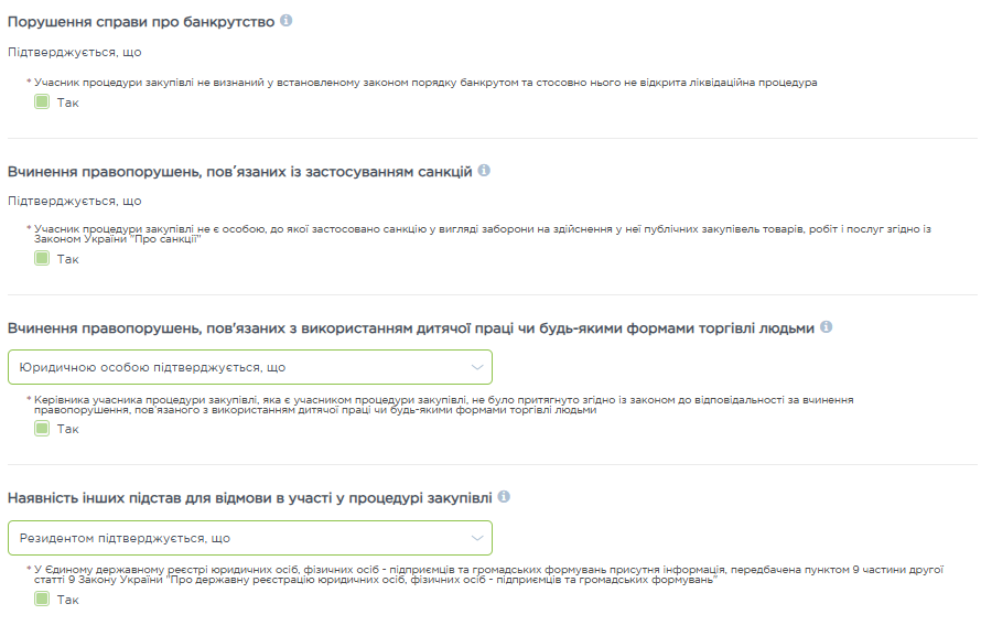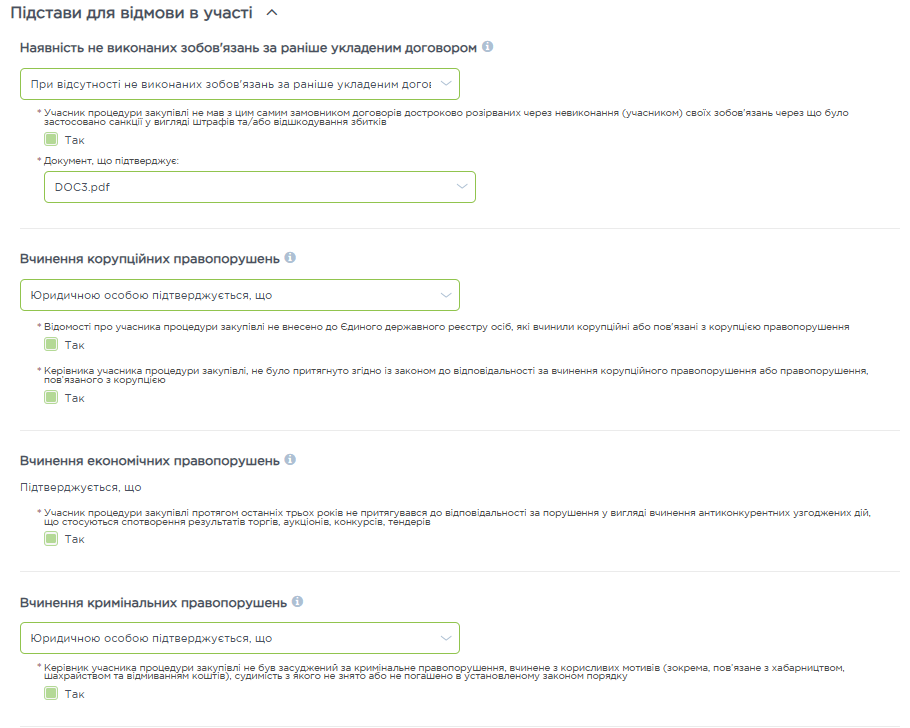 Усі ці поля є електронними, але замовник може вимагати документального підтвердження цих пунктів. У такому разі відповідні файли потрібно завантажити до тендерної пропозиції.