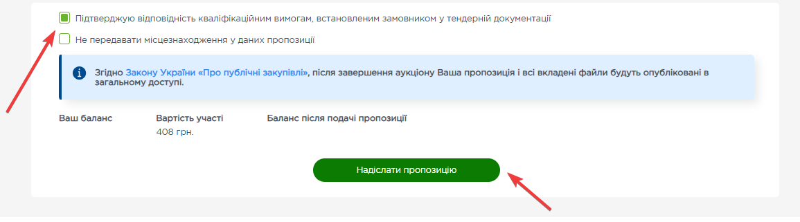 Останніми кроками в поданні пропозиції є підтвердження відповідності пропозиції кваліфікаційним вимогам, встановленим замовником у вимогах тендерної документації, і вибір, чи передавати інформацію про місцезнаходження компанії у даних пропозиції.