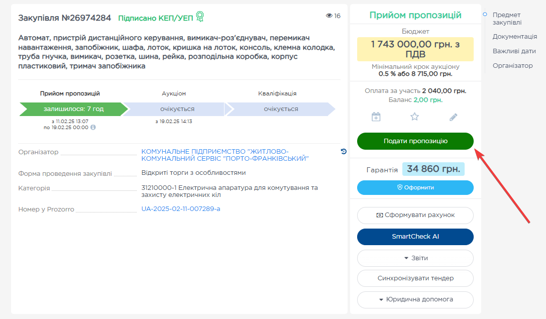 Після цього відкриється сторінка подачі тендерної пропозиції.