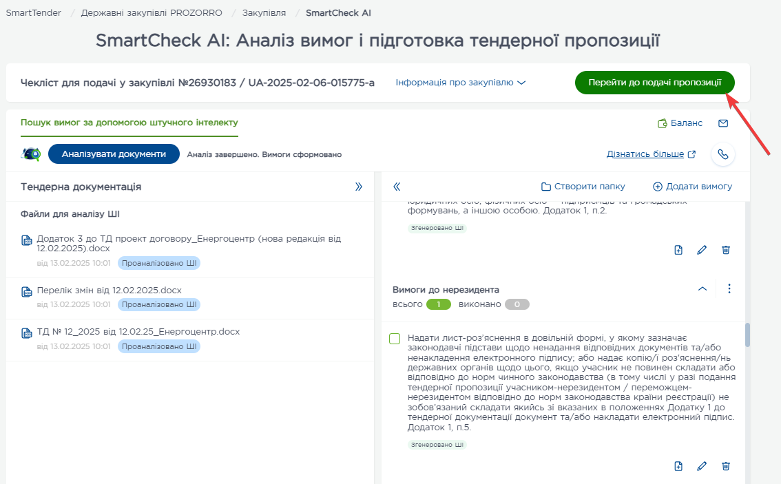 Або ж на сторінці аналізу тендерної документації замовників через SmartCheck AI виберіть «Перейти до подачі пропозиції» (Рис. 4).