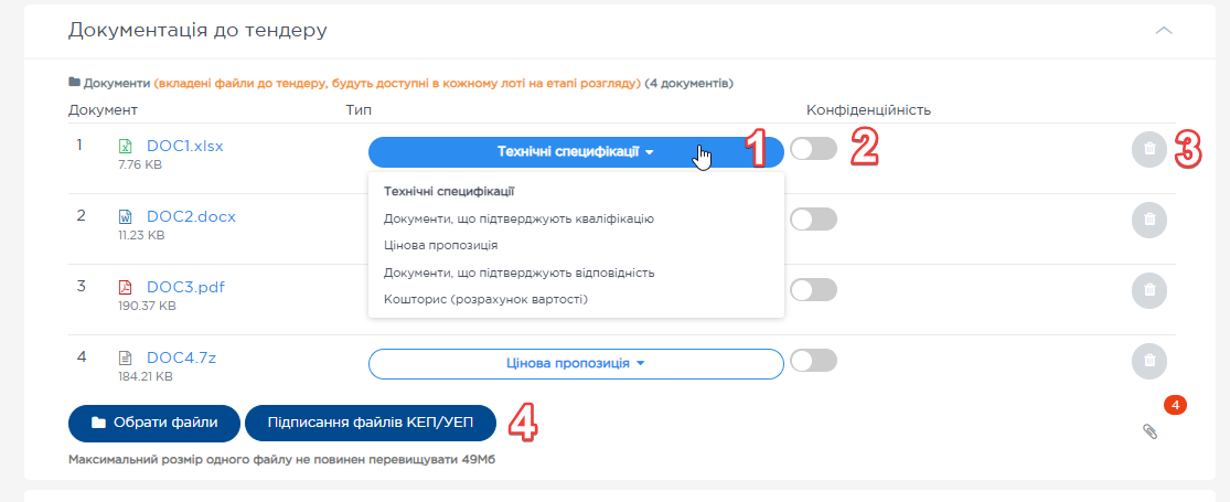 - Додати ознаку конфіденційності (інші учасники не можуть побачити цей документ у складі документів, коли пропозиція буде розкрита на етапі прекваліфікації або кваліфікації). Конфіденційною не може бути визначена інформація про запропоновану ціну, інші критерії оцінки, технічні умови, технічні специфікації та документи, що підтверджують відповідність кваліфікаційним критеріям відповідно до статті 16 Закону, і документи, що підтверджують відсутність підстав, визначених пунктом 47 Особливостей;