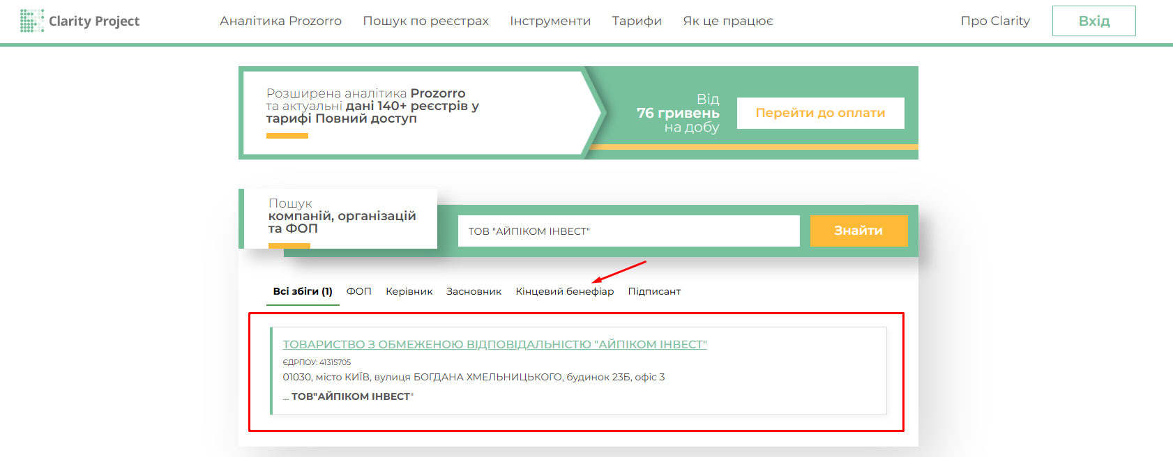 З’ясувати ім’я кінцевого бенефіціара компанії легко за допомогою аналітичної платформи Clarity Project: для цього достатньо ввести в поле пошуку назву чи код потрібної компанії чи організації.