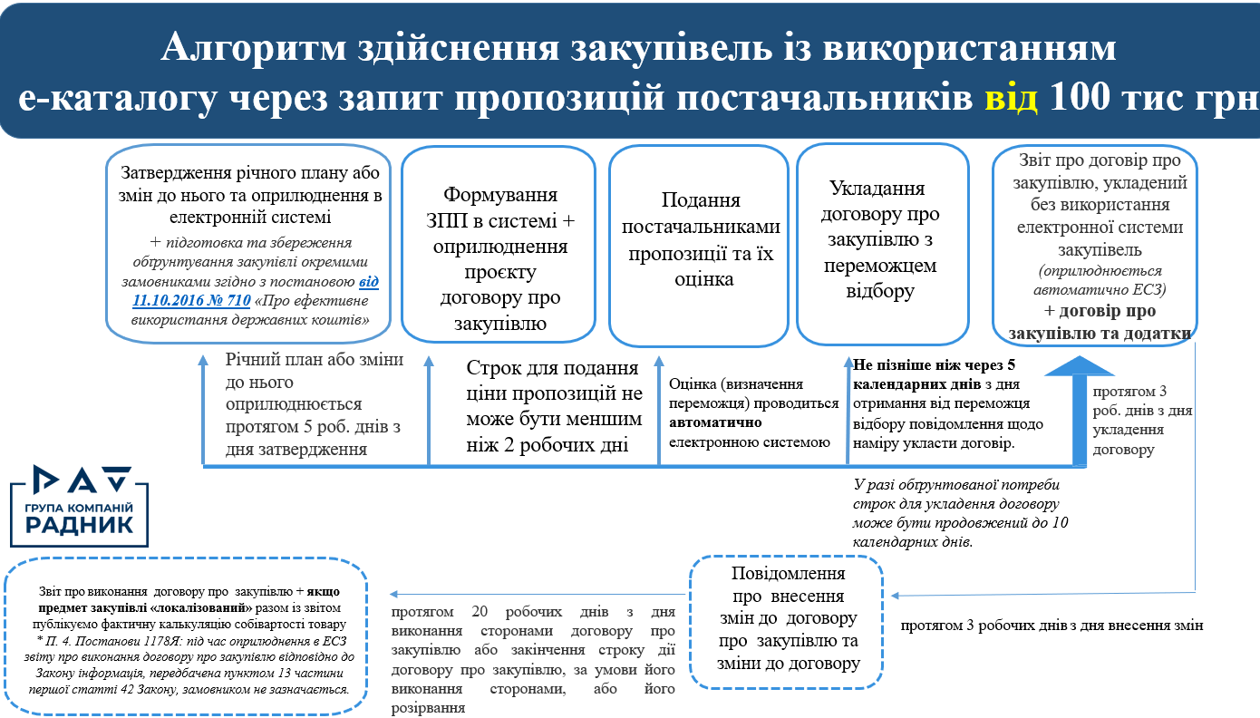 9 | Оприлюднення звіту про договір, укладений без використання електронної системи закупівель | Пунктом 68 Порядку № 822 встановлено, що за результатами проведеного відбору постачальника через електронний каталог замовник оприлюднює звіт про договір про закупівлю, укладений без використання електронної системи закупівель, відповідно до статті 10 Закону (технічно формується електронною системою автоматично). Якщо вартість закупівлі від 100 тис. грн, то згідно з пунктом 10 Особливостей за результатами здійснення закупівлі в електронній системі закупівель замовником оприлюднюється договір про закупівлю та додатки до нього відповідно до вимог Закону з урахуванням цих особливостей, а саме протягом трьох робочих днів з дня його укладення (пункт 10 частини 1 статті 10 Закону). |