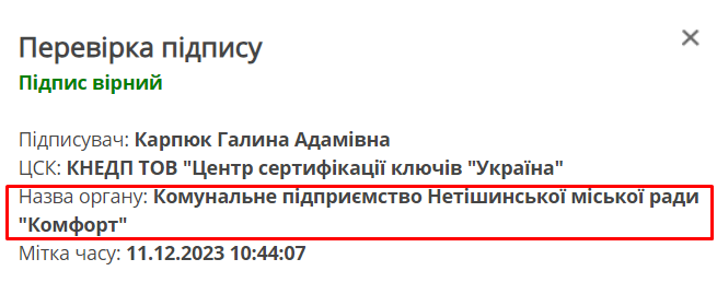 Наприклад, під час перевірки підпису, яким було оприлюднено оголошення в Прозорро, можна побачити назву замовника, в якого працює та в цілях якого проводить публічні закупівлі уповноважена особа.