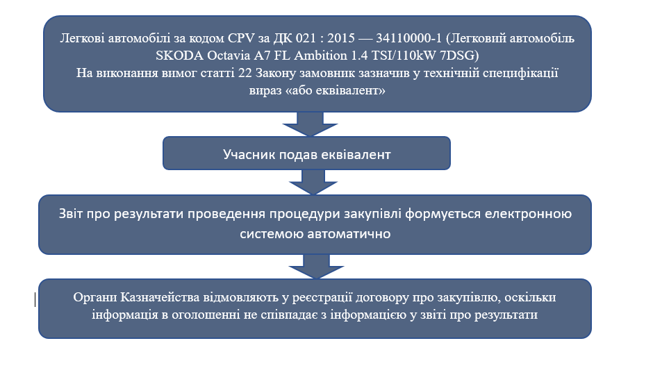 На таку закупівлю приходить учасник з еквівалентом (з автомобілем іншої марки), але показники якого еквівалентні SKODA Octavia, і замовник такого учасника визначає переможцем та укладає з ним договір про закупівлю.