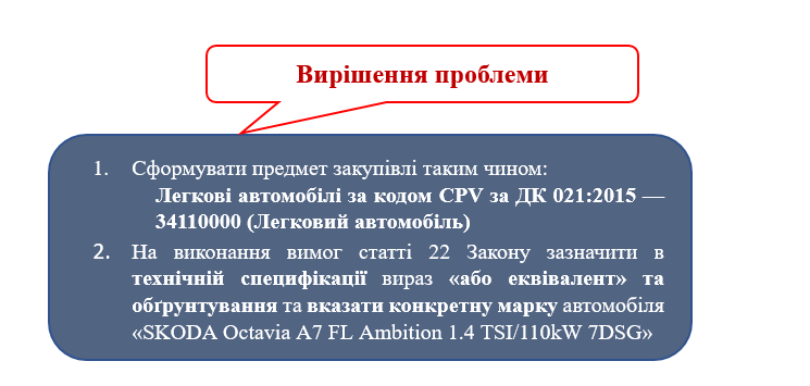 Наприклад, замовник хоче придбати легкові автомобілі за кодом CPV за ДК 021:2015 — 34110000-1 (Легковий автомобіль SKODA Octavia A7 FL Ambition 1.4 TSI/110kW 7DSG).