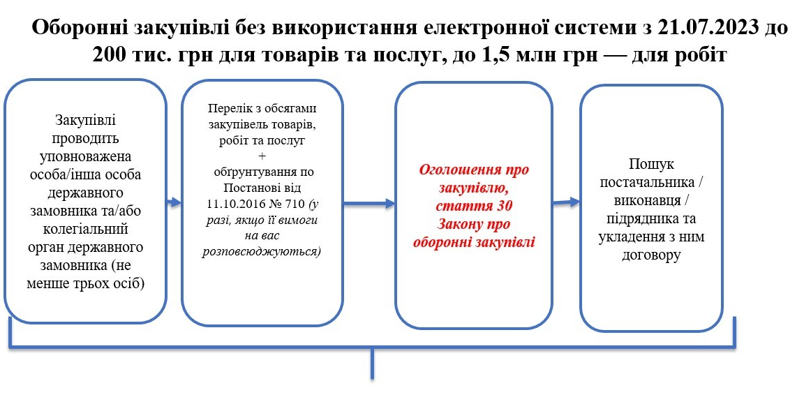 Але станом на листопад-2023 незрозуміло, де в зазначеному Мінекономіки пункті встановлено порядок та умови здійснення допорогових оборонних закупівель (тобто від копійки й до 200 тис. грн для товарів та послуг та до 1,5 млн для робіт). Доцільно завантажити шпаргалку щодо вартісних меж закупівель оборонного призначення з 21.07.2023.