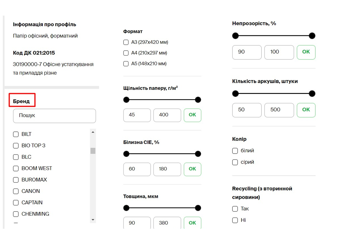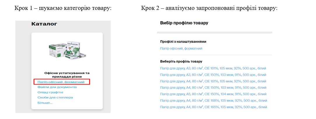 Спробуємо візуально зобразити аналіз електронного каталогу на прикладі закупівлі паперу офісного на електронному майданчику Zakupivli.pro.