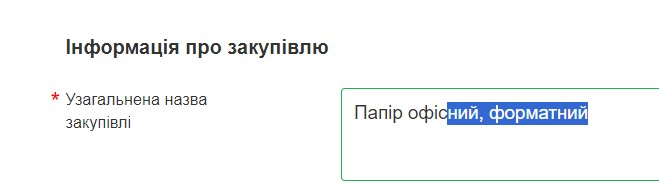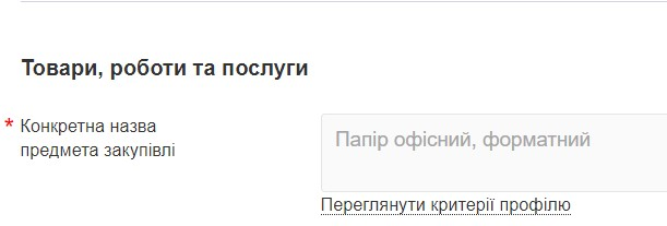 Зверніть увагу! Назва профілю товару в електронній системі закупівель, який ви виберете для подальшого оголошення запиту пропозицій постачальників (наприклад, «Папір офісний, форматний»), на більшості електронних майданчиків у подальшому автоматично відобразиться в електронних полях вашого оголошення, а саме в полі: