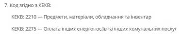 - 2275 «Оплата інших енергоносіїв та інших комунальних послуг» (у разі закупівлі енергоносіїв, що використовуються в процесі виробництва теплоенергії або іншого виду енергії (у тому числі нафтопродукти (у разі, якщо закупівля не передбачена на інші цілі за кодом 2210 «Предмети, матеріали, обладнання та інвентар»)).
