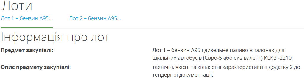 «ДК 021:2015 09130000-9 „Нафта і дистиляти“: Лот 1 — бензин А95 і дизельне паливо в талонах для шкільних автобусів, КЕКВ 2210; Лот 2 — бензин А95 і дизельне паливо в талонах для заправки генераторів для вироблення електричної енергії в закладах освіти, КЕКВ 2275».