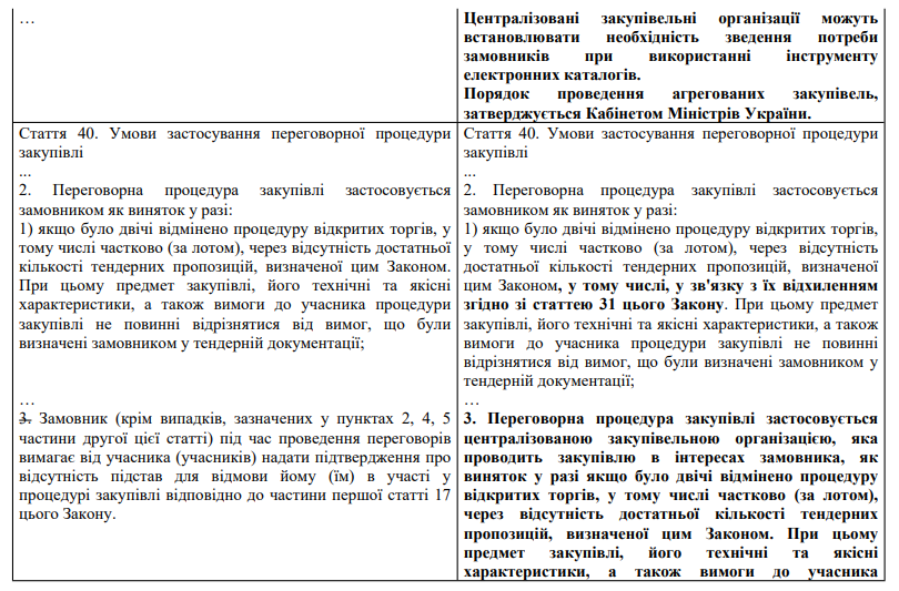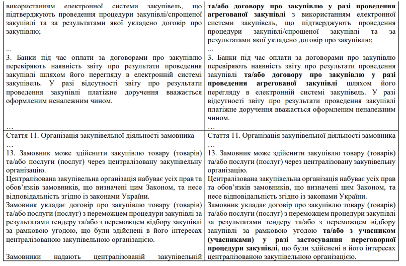 Наведемо порівняльну таблицю до проєкту Закону України про внесення змін до Закону України «Про публічні закупівлі» щодо удосконалення системи медичних закупівель.