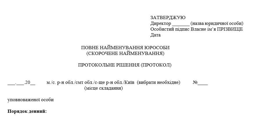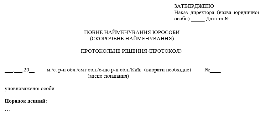 Також документ може бути затверджено іншим розпорядчим рішенням юридичної особи, тоді зазначається назва виду розпорядчого документа в називному відмінку, його дата та номер. У таких випадках документ, яким затверджено, радимо публікувати в електронній системі закупівель разом з обґрунтуванням. Приклад: